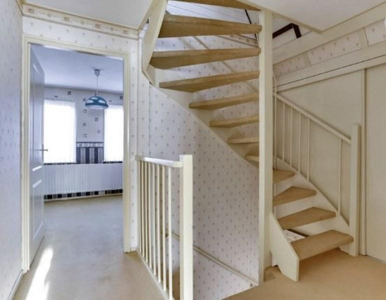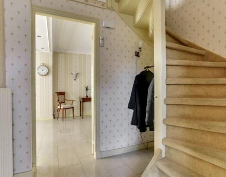 Hall with luxurious tile floor including floor heating, wardrobe cleans and staircase.
