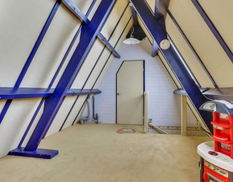 Bedroom/hobby room equipped with carpet, skylight washing machine connection.