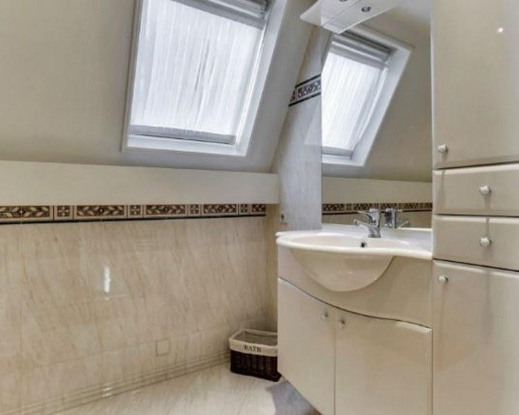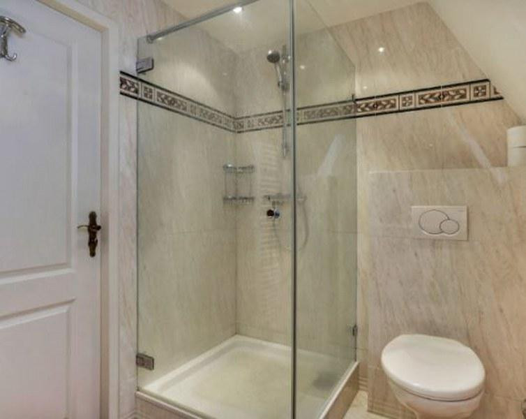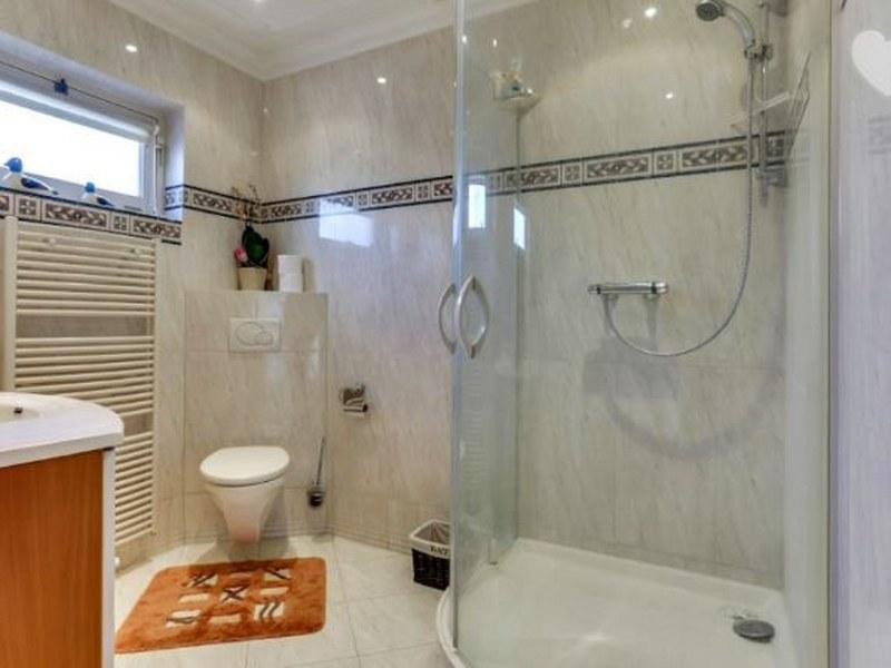 Luxurious fully tiled bathroom with tiled floor, shower with thermostat, 2nd toilet, sink and radiator.
