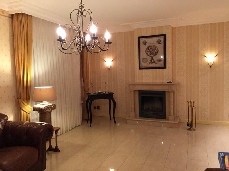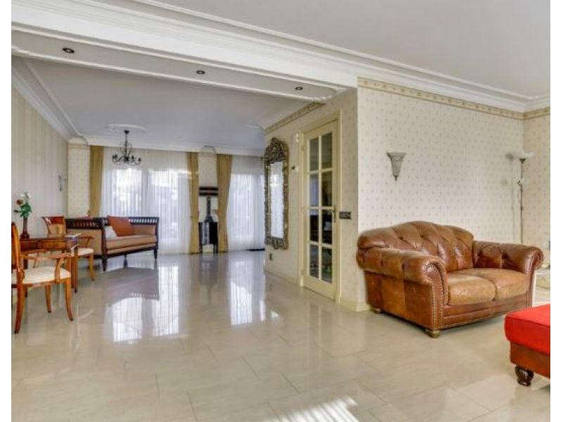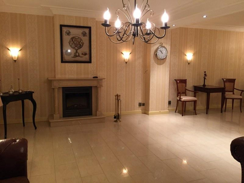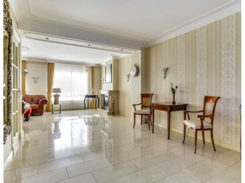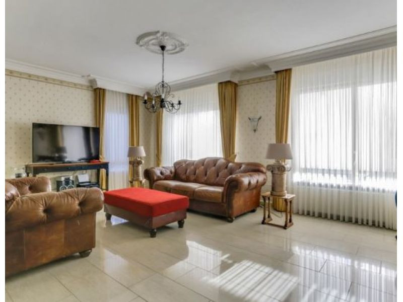 Spacious, bright and spacious living room with tiled floor, including underfloor heating, electric fireplace and double doors to the garden.