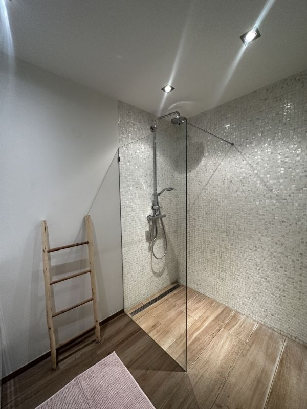 Bathroom has a walk-in shower, wash basin with matching vanity unit.