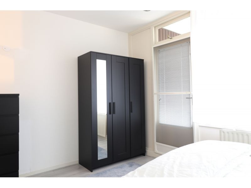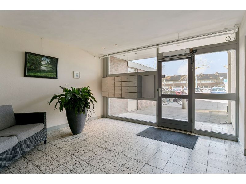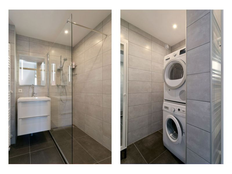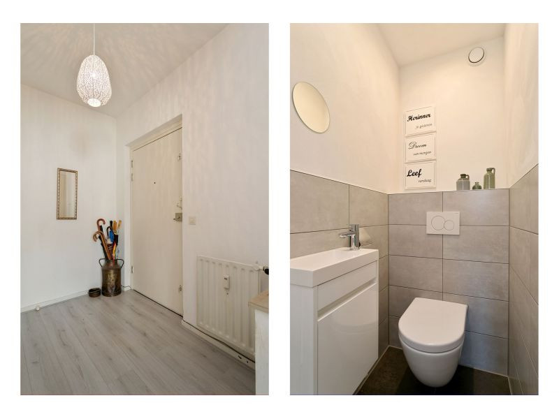 This beautiful and modern bathroom is fully tiled. The spacious room is equipped with a washbasin in a piece of furniture, a mirror above it (including lighting), a walk-in shower (with glass splash screen and thermostatic tap), a towel radiator and a connection for the washing machine and dryer. The bathroom also has a stucco ceiling with recessed spotlights.