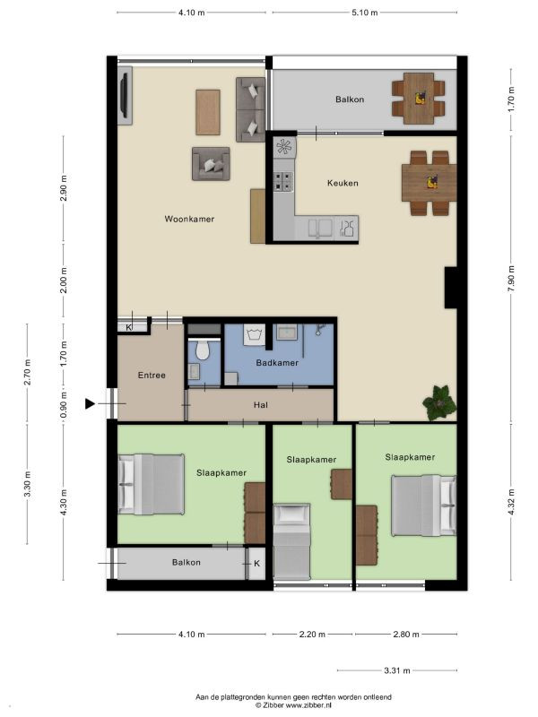 Both a spacious bedroom and the "sleeping wing" (with the other two bedrooms, the bathroom and the toilet) can be reached via the dining area of ​​the living room.