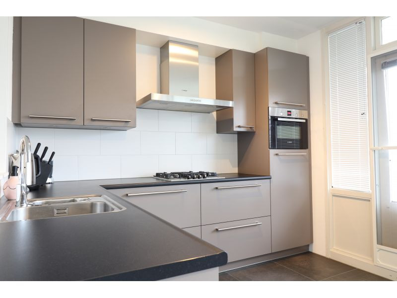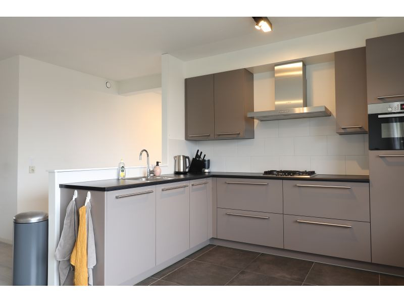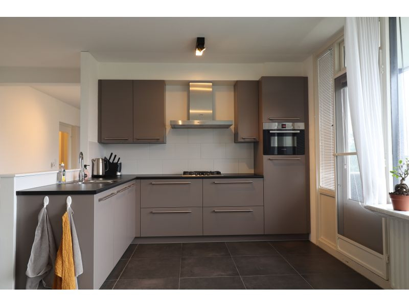 In mid-2017 the kitchen was modern and luxuriously renovated. The L-shaped, liver-colored kitchen installation is equipped with various upper and lower cabinets, drawers (with soft-close system), a plastic worktop, one and a half sinks and built-in appliances such as: a dishwasher, 4-burner gas hob, a stainless steel extractor hood, combi oven and a refrigerator. The kitchen also has a tiled back wall and a tiled floor. A door (including screen) provides access to the balcony and the kitchen window has a practical screen (manually operated).