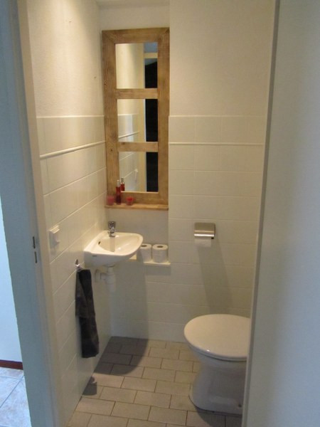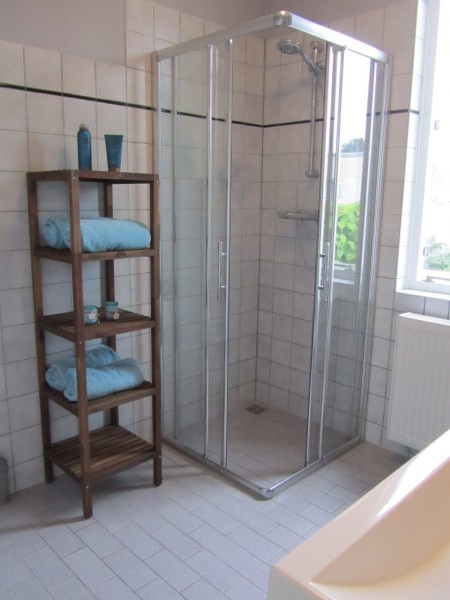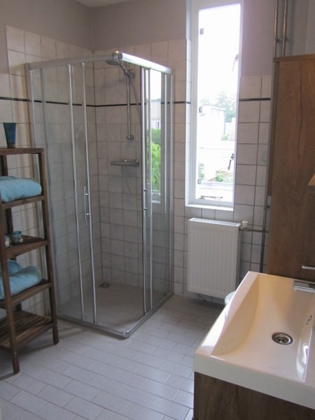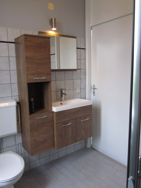 In de badkamer bevindt zich een douche, een toilet en een wastafel met meubel.