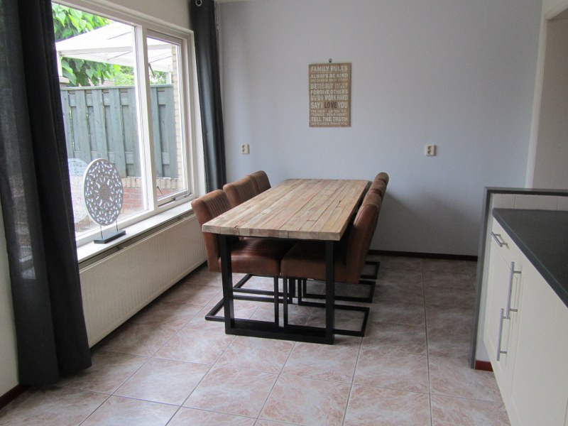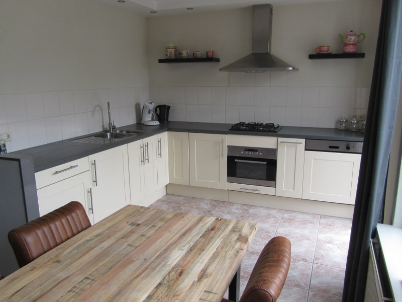 De nieuwe en moderne open woonkeuken is geplaatst in een hoekopstelling. Door de stijlvolle interieurindeling heeft u praktische opbergruimte met schuifladen inclusief alle denkbare apparatuur, zoals de combi-oven, koelkast en vaatwasmachine. Daarnaast is het keukenblad voorzien van een 4-pits gasfornuis met daarboven een grote afzuigkap en anderhalve spoelbak. Door de grote raampartijen heeft u veel lichtinval en kijkt u uit op de tuin.