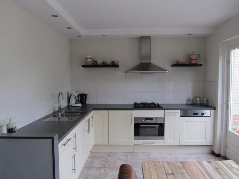 Met de grote raampartijen aan de achterzijde van de moderne woonkeuken heeft u uitzicht op de ruime achtertuin.