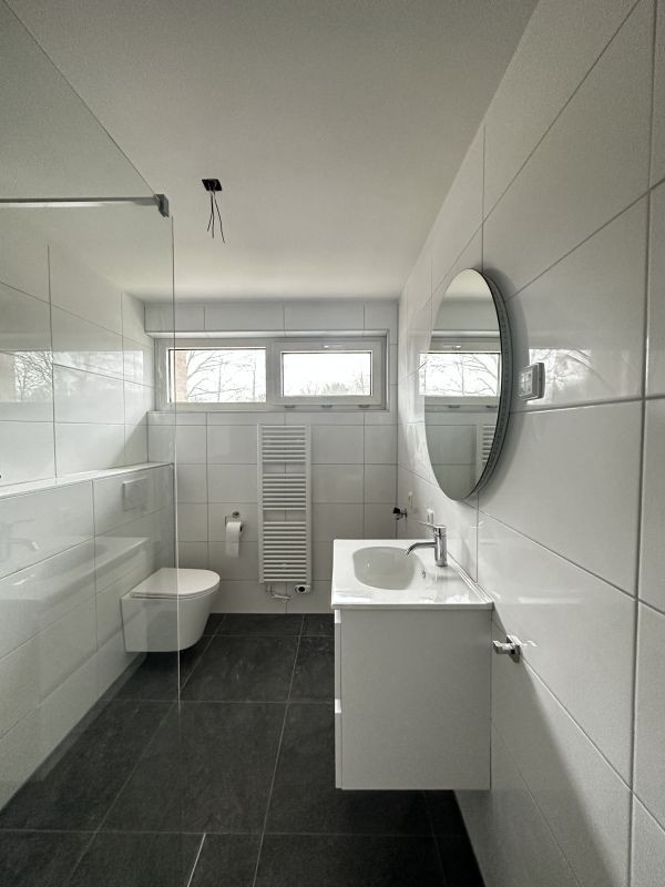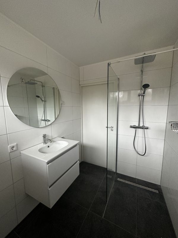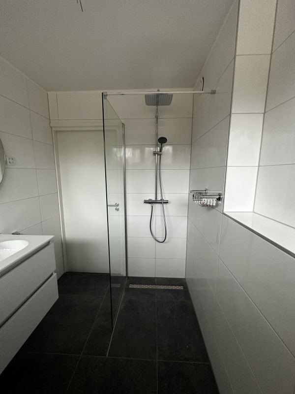 Luxe badkamer geheel betegeld met inloopdouche, wastafel met bijpassend meubel en toilet.