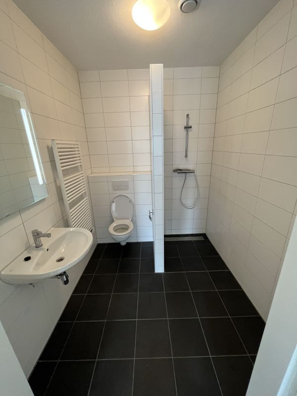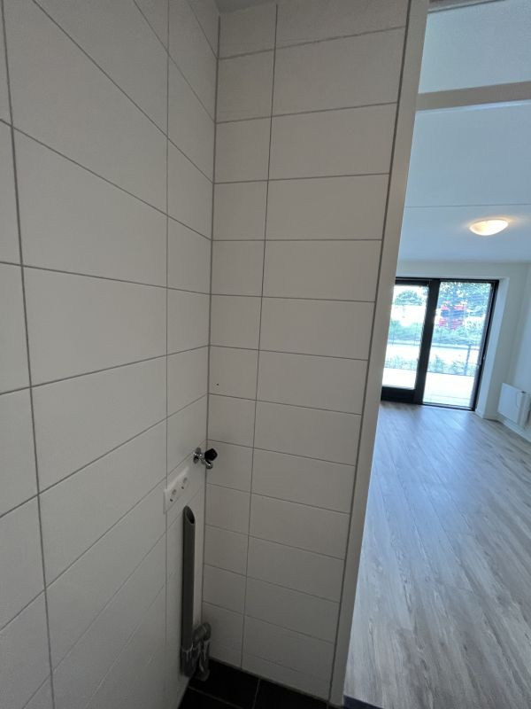 Moderne witte keuken met grijs aanrechtblad, voorzien van de volgende gemakken: koelkast, inductieplaat, afzuigkap, spoelbak, combi magnetron/oven en vaatwasser. Vanuit woonkamer toegang tot tuin, tevens ook tot de slaapkamer. De badkamer is vanuit de slaapkamer te bereiken, hier zit ook een aansluiting voor de wasmachine. Badkamer is voorzien van wastafel, WC, inloopdouche en designradiator. Vanuit de slaapkamer ook toegang tot de tuin.